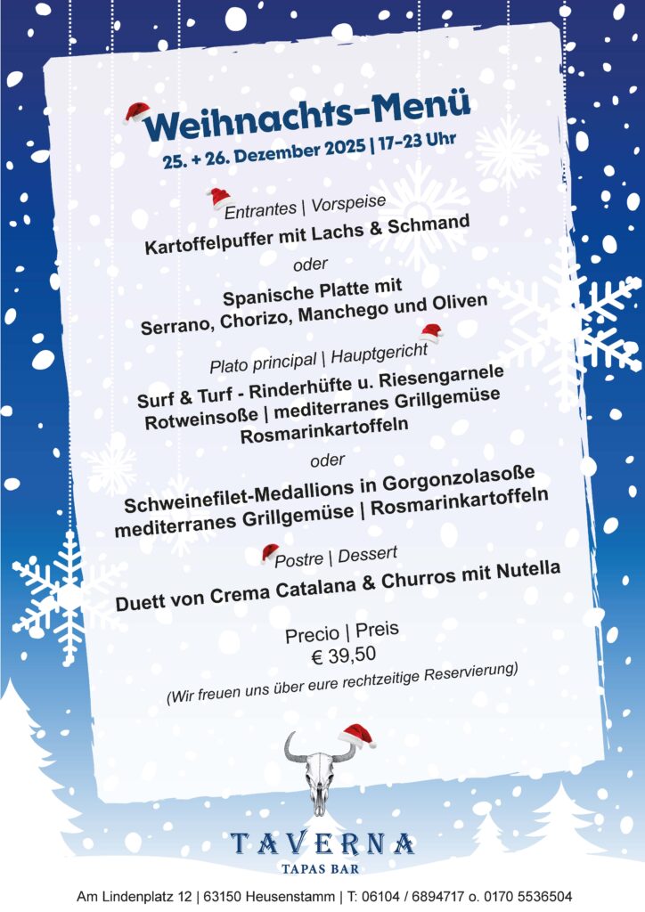 An den beiden Weihnachtsfeiertagen am 25. und 26. Dezember 2025 bieten wir ein 3-Gang Weihnachtsmenü zum Festpries von EUR 39,50 an. Bei den Vorspeisen und Hauptgängen kann jeweils aus zwei Gerichten gewählt werden. Wir freuen uns auf eure Reservierung.